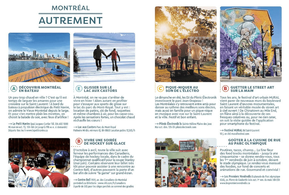 Vieux-Montréal et gratte-ciel, plateau Mont-Royal, berges du Saint-Laurent, boutiques de créateurs et magasins souterrains, restos 100% poutine ou gastronomiques, vélo ou patin à glace, échappée dans une cabane à sucre : suivez le guide ! – Un concept unique : des cartes grand format dépliables par quartier – Les incontournables, visites, restos et sorties localisés sur les cartes – Des idées pour découvrir la ville autrement + une balade à vélo à retrouver sur Geovelo.